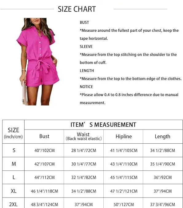 - Casual playsuits rompers with removable self-tie belt at waist. Relaxed loose fitting. Rompers for women summer. Button down romper playsuit. Romper for women elegant. Short sleeve rompers for women. Womens rompers for summer.